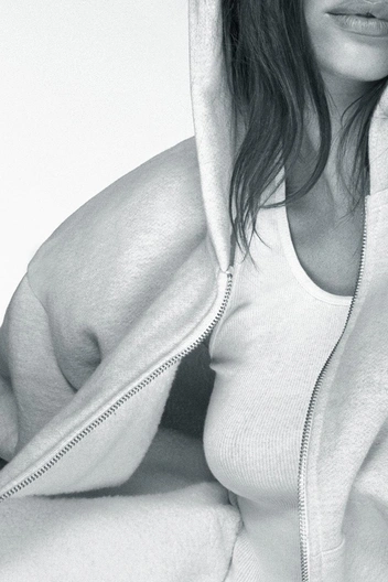 Центральное место в коллекции заняли объемные кожаные куртки на молнии и худи с акцентными «подбитыми» плечами — той самой архитектурной деталью, которую модель в последнее время активно выгуливала в своих стритстайл-выходах. Вся капсула выдержана в строгом монохроме: только белый, серый и черный. Этот выбор подчеркивает переход бренда от простого комфорта к более острому прочтению «спортивной романтики», где расслабленность встречается с жестким кроем.