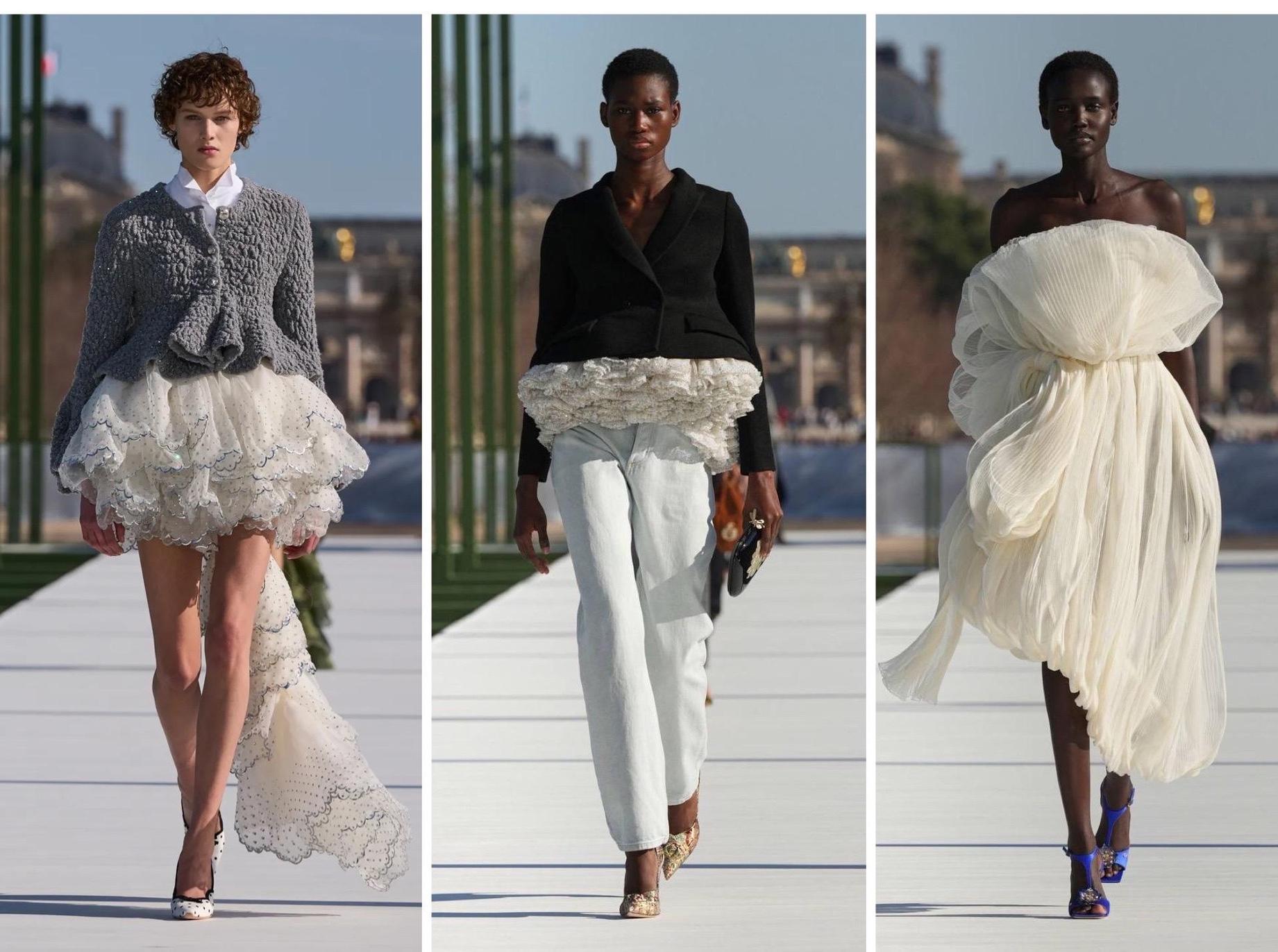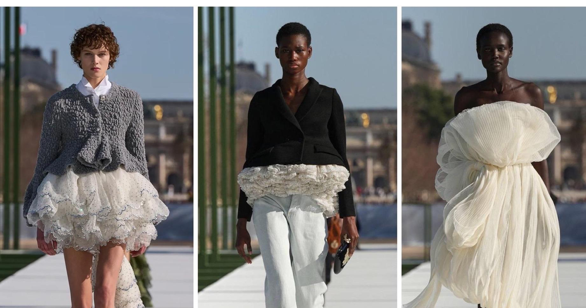 В новой коллекции Андерсон продолжил линию, начатую в январском кутюре — это фэшн-фантазия на тему сада. Цветочное и водное переплетаются. Первый выход — объемная мини-юбка с длинным, почти медузообразным шлейфом, в паре с блестящим кардиганом-фартуком с легким пеплумом. Коды дома переосмыслены: укороченная версия жакета Bar украшена обильными многослойными кружевами в сочетании с пышной юбкой или простыми джинсами.