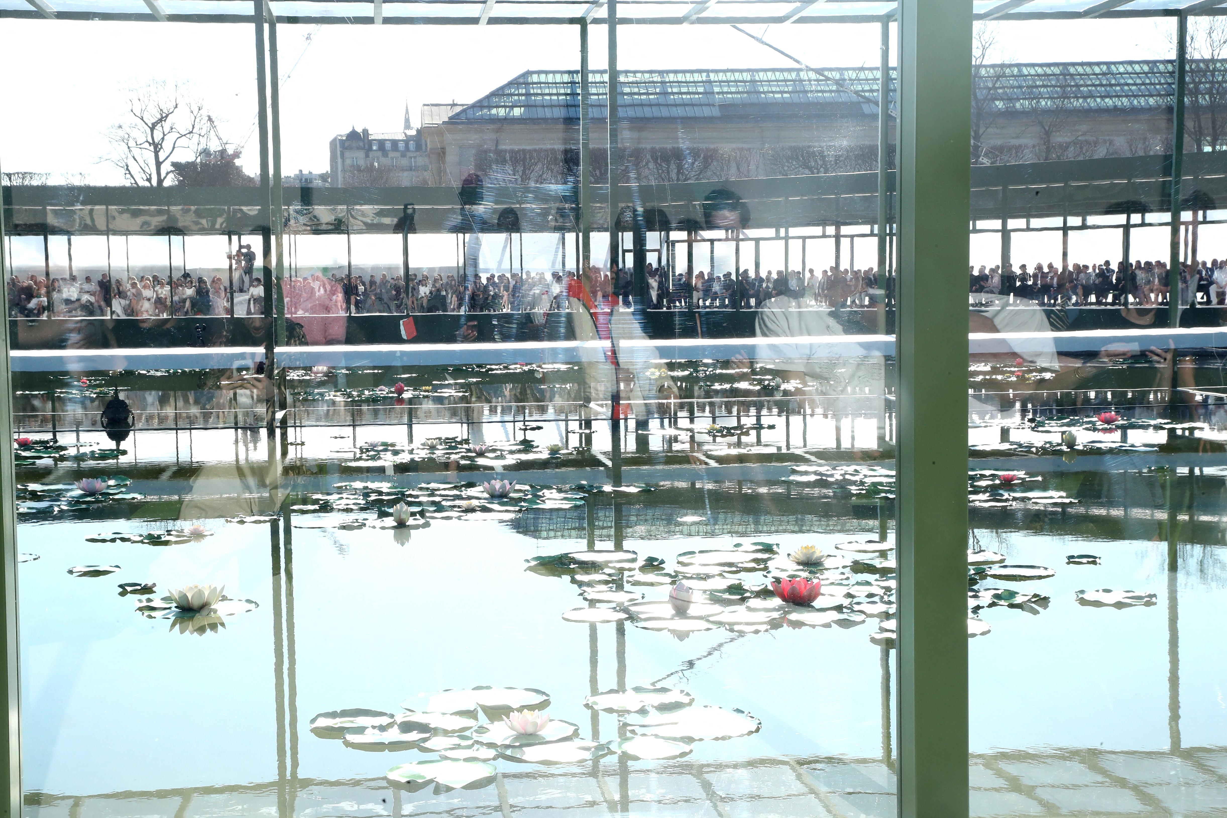 В качестве приглашения всем гостям отправили миниатюрные версии знаменитых зеленых стульчиков сада Тюильри (об их фантастической истории мы рассказывали в отдельном материале). Нравится, что в оттенок стульев Dior окрасил свой логотип в инстаграме. В Тюильри проходят все женские шоу французского Дома за исключением кутюра. Но, как оказалось, мини-стулья стали метафорой созерцания. Именно в акт коллективного созерцания на фоне искусственных, но очень реалистичных кувшинок у восьмиугольного пруда-бассейна, погрузились сотни гостей показа. Пространство выстроили вокруг фонтана, превратив его в подобие оранжереи. Это было невероятно красиво и возвышенно! Идиллия ранней весны.