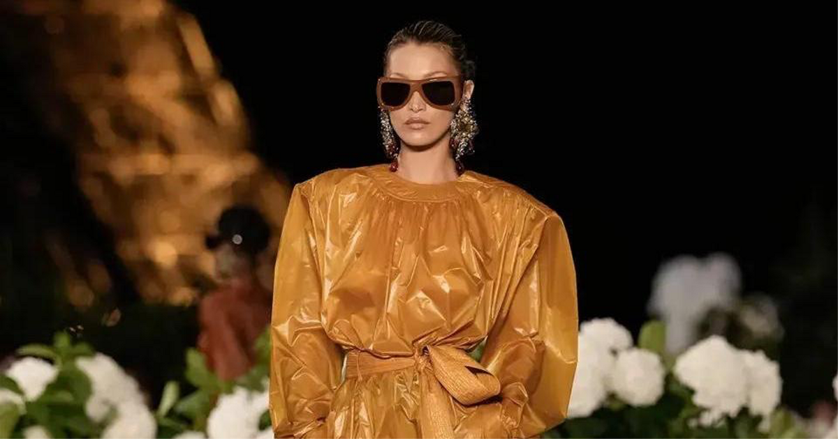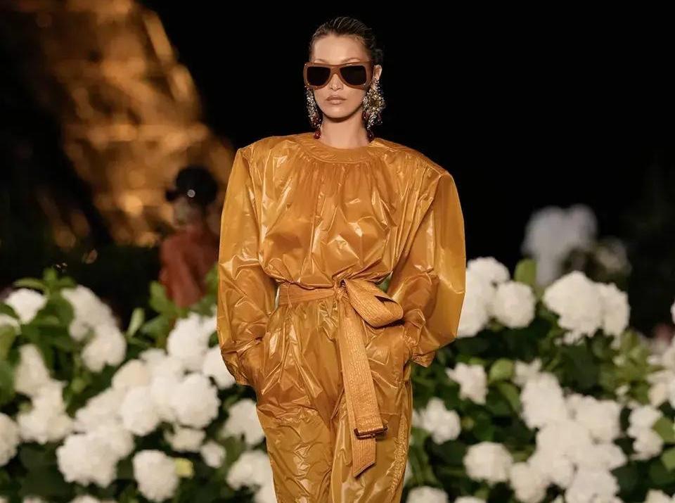 Показ Saint Laurent прошел 29 сентября в саду с видом на Эйфелеву башню (монумент всегда становится важным участником шоу Энтони Ваккарелло). Хадид представила образ из летней коллекции 2026 года: прозрачный тренч, надетый задом наперед, крупные серьги и массивные солнцезащитные очки. Атмосфера шоу, созданного креативным директором Энтони Ваккарелло, напоминала кино. В описании коллекции отмечалось, что «стиль становится формой диалога в мире, где слова утрачивают силу».