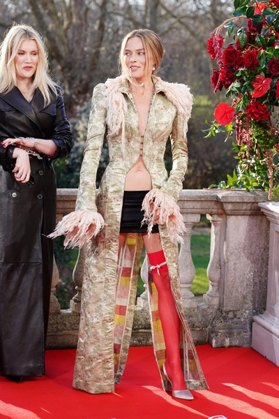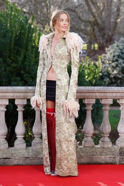 Пальто с набивным цветочным рисунком и фантазийными эполетами и манжетами из бледно-розовой овчины, надетое на голое тело. В этом образе угадывались отсылки к имперской декоративности времен императрицы Жозефины, но при этом он остается современным даже сегодня. Стилист Марго, Эндрю Мукамал, решил повторить подиумный образ точь-в-точь: черная микро-юбка, пояс и вызывающие красные чулки выше бедра с кокетливо повязанной вместо подвязки тонкой розовой ленточкой. Горячо! Во времена Эмили Бронте подобная чувственность была бы немыслима. Именно в этом и заключается ключевой прием: актриса не пытается одеться как героиня романа, а интерпретирует ее эмоциональную природу через язык моды. Еще одна фишка фэшн-тура — обязательный красный цвет в каждом образе, такого же приема художники по костюмам придерживаются и на экране.