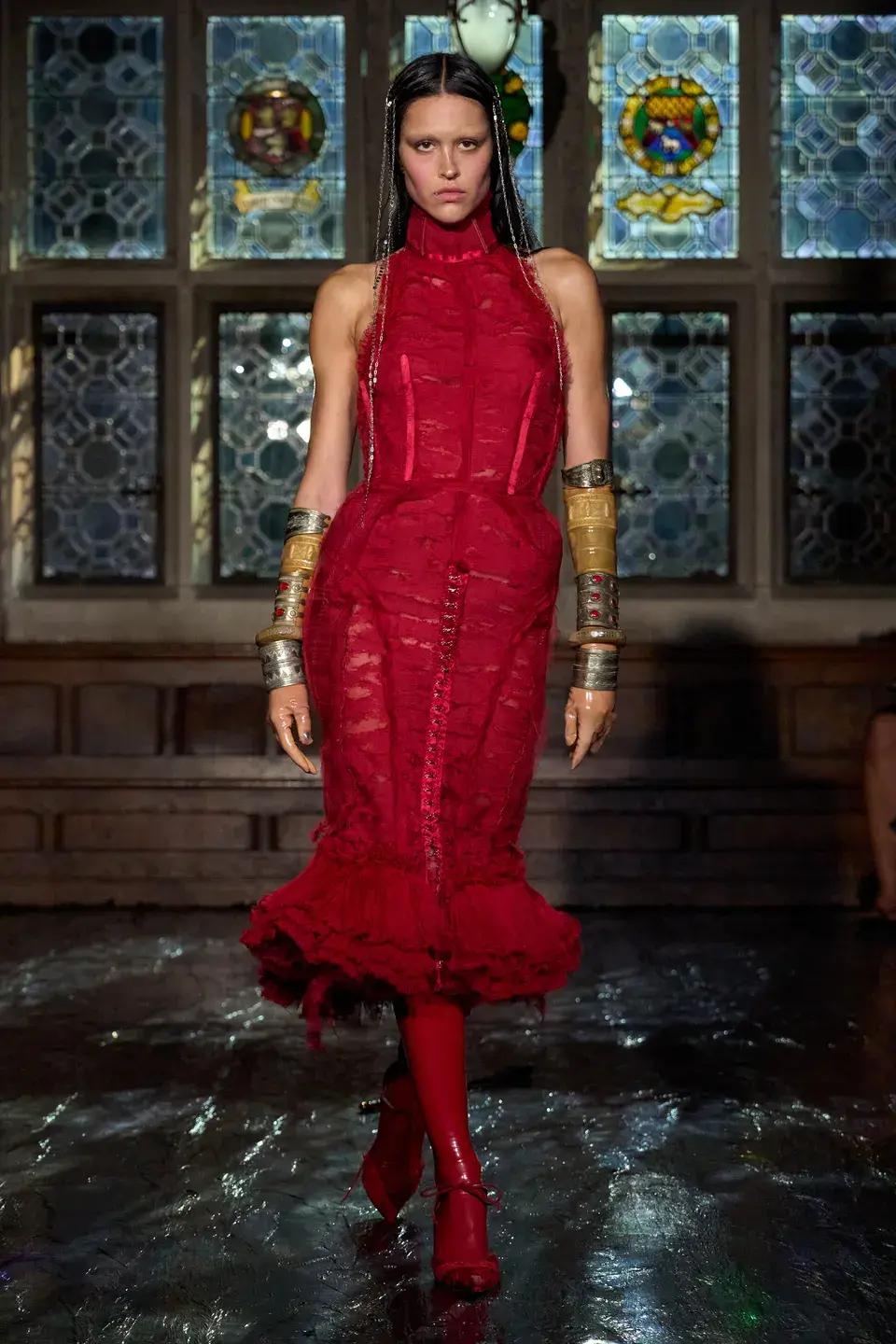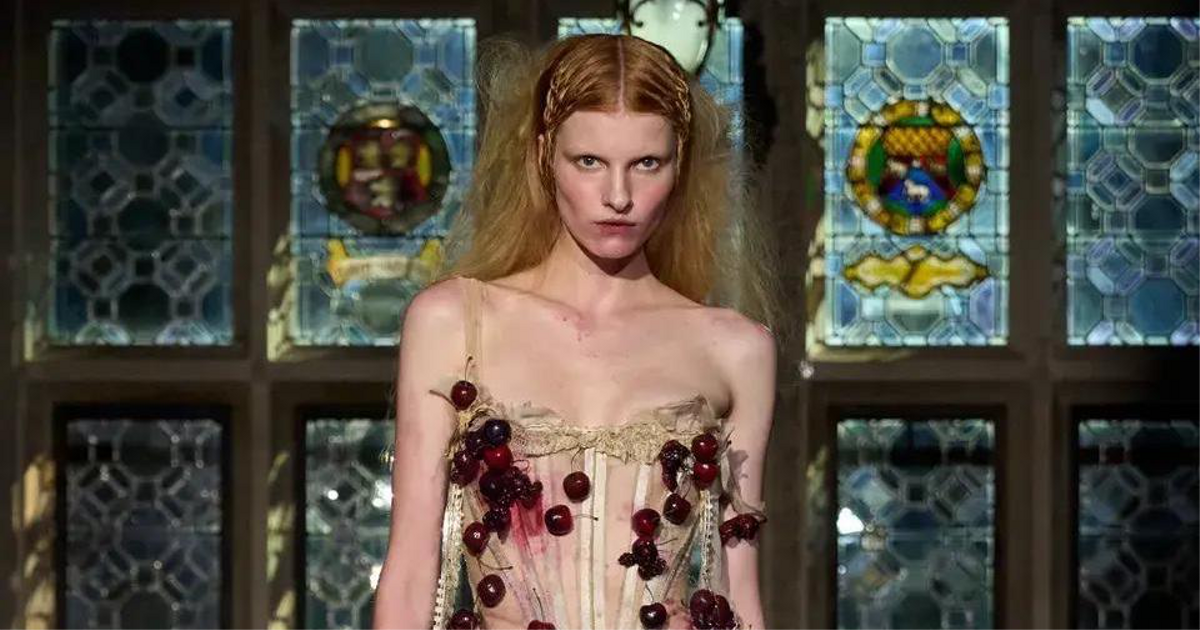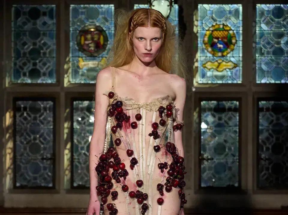Самый обсуждаемый, «вирусный», образ всего шоу — кремовое корсетное платье, украшенное раздавленными ягодами черешни, которые очень реалистично выполнены из силикона. Это «пародия» дизайнера на милые деревенские сарафаны с рисунком в аккуратную вишенку. Другая «вишенка на торте» — кастинг. Один из закрывающих образов на подиуме представила легендарная Наоми Кэмпбелл.