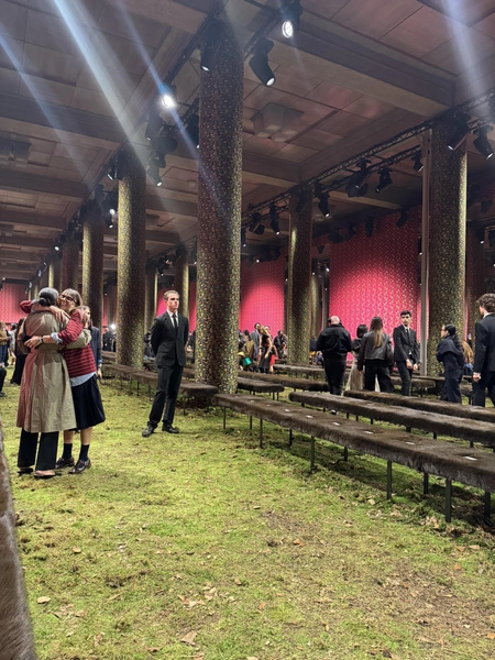 Сначала про сеттинг. Он был по-настоящему впечатляющим. Как только гости отодвигали входную штору Дворца Йена, то попадали если не в Нарнию, то в заколдованный лес или даже на болото. В воздухе чувствовался запах сырости. Организаторы застелили весь пол мхом, травой, жухлыми листьями. Стены про этом затянули алым брокатом, в которой обернули и приглашение, присланное накануне. Гости оказались в пространстве, похожем на архаичную поляну, каким-то образом перемещенную в центр Парижа. Декорации работали на главную идею коллекции: противостояние маленького человеческого тела и огромного мира вокруг.