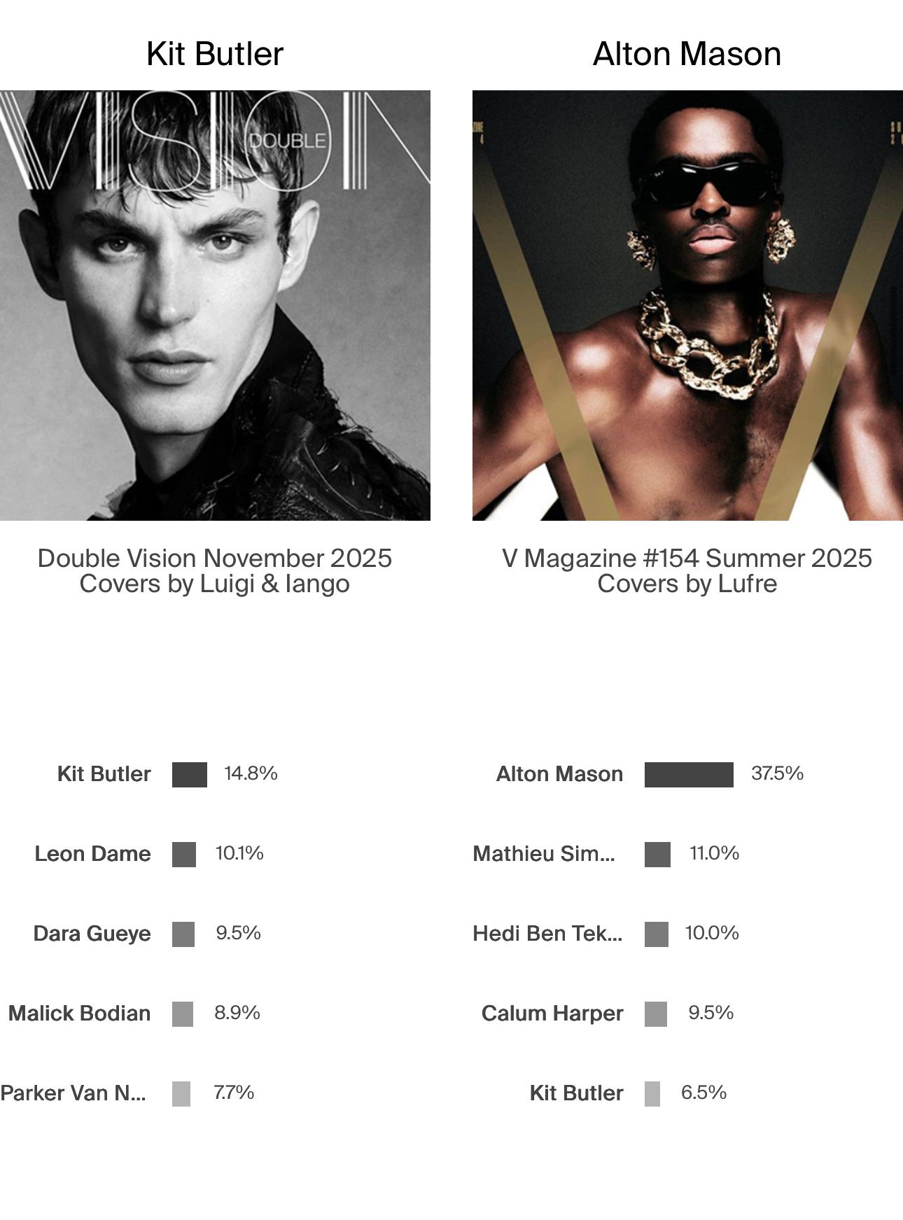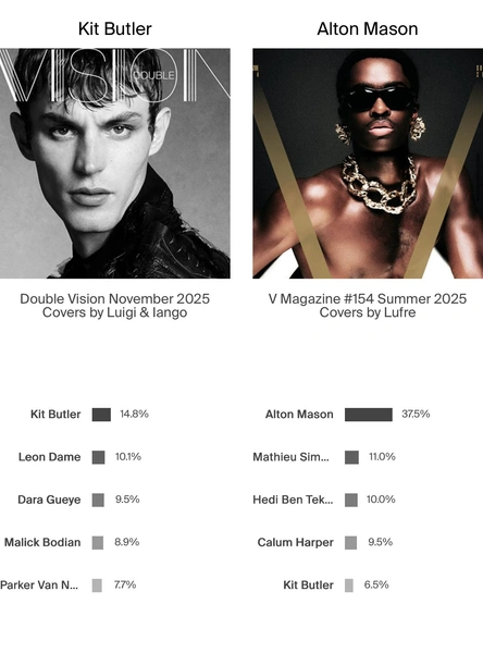 В параллельном голосовании читателей Models.com безоговорочную победу одержал Элтон Мэйсон — самая титулованная мужская модель в истории индустрии. Его результат в 2025 году составил 37,5% голосов, что значительно опередило ближайших конкурентов. (Кит Батлер в народном голосовании занял пятую строчку с 6,5% голосов) За свою карьеру Элтон Мэйсон десять раз становился «Моделью года» по версии профессионалов и дважды побеждал в читательском голосовании. В общей сложности он 14 раз попадал в номинации — абсолютный рекорд для мужской категории! Его обожают как крупнейшие модные Дома, так и нишевые бренды, работающие на стыке моды, перформанса и культуры.