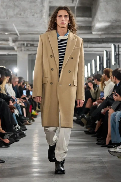 Как пример такой «вариации на тему» — признание Маттиусси в самоповторе: один из образов оказался почти идентичен его самому первому шоу 2011 года. Верблюжье пальто с заостренными лацканами, морская полоска и белые джинсы — формула, с которой когда-то начался Ami. Однако в версии 2026 года этот образ стал взрослее: пальто удлинилось и лучше село по плечам, мариниер получил белый воротник и более мягкую фактуру, джинсы обрели четкую стрелку, а обувь стала более графичной.