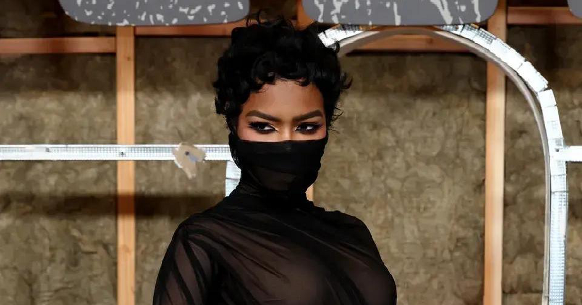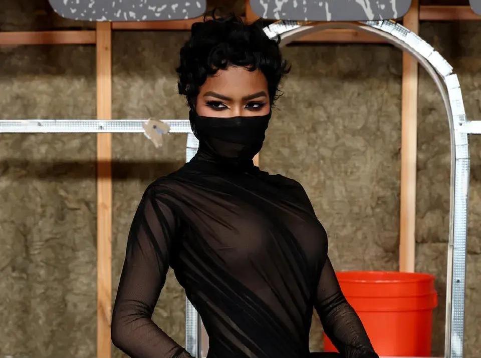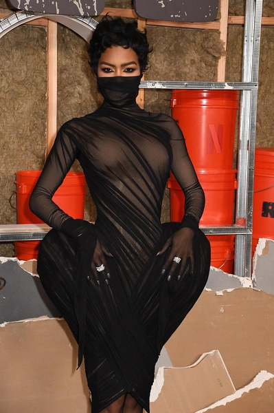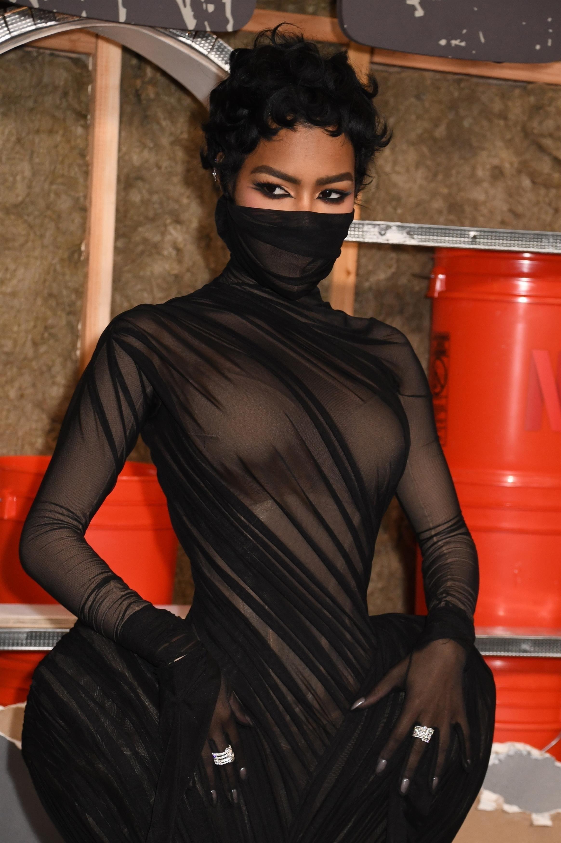 Даже с закрытой частью лица макияж звезды оставался фирменным — чрезмерно выразительным. А ее короткая стрижка пикси была уложена в мягкие завитки, брови подчеркнуты, а глаза оформлены в кошачьем стиле. Образ дополнял хромированный серебряный маникюр, который был заметен сквозь прозрачные рукава, переходящие в перчатки.