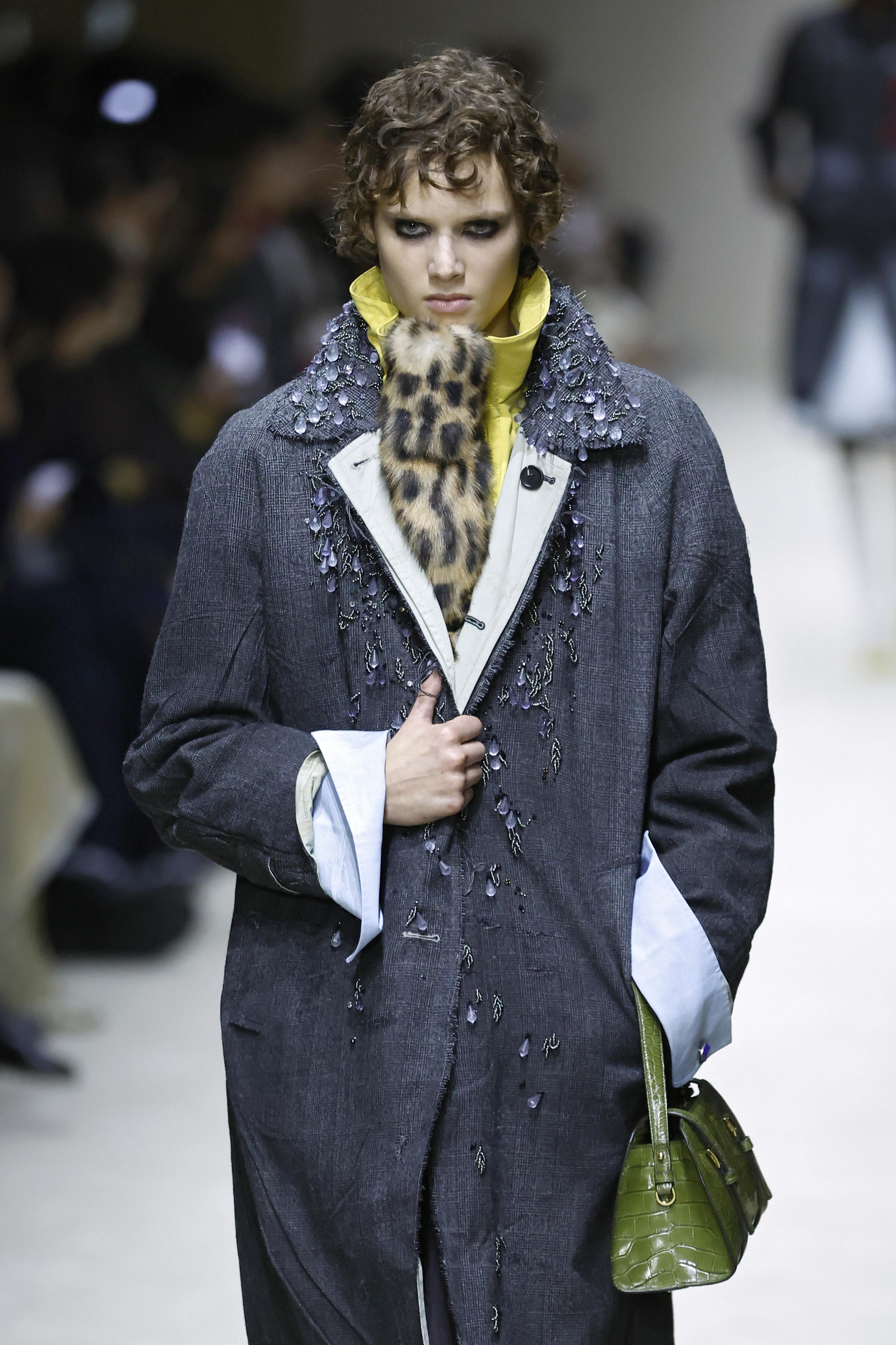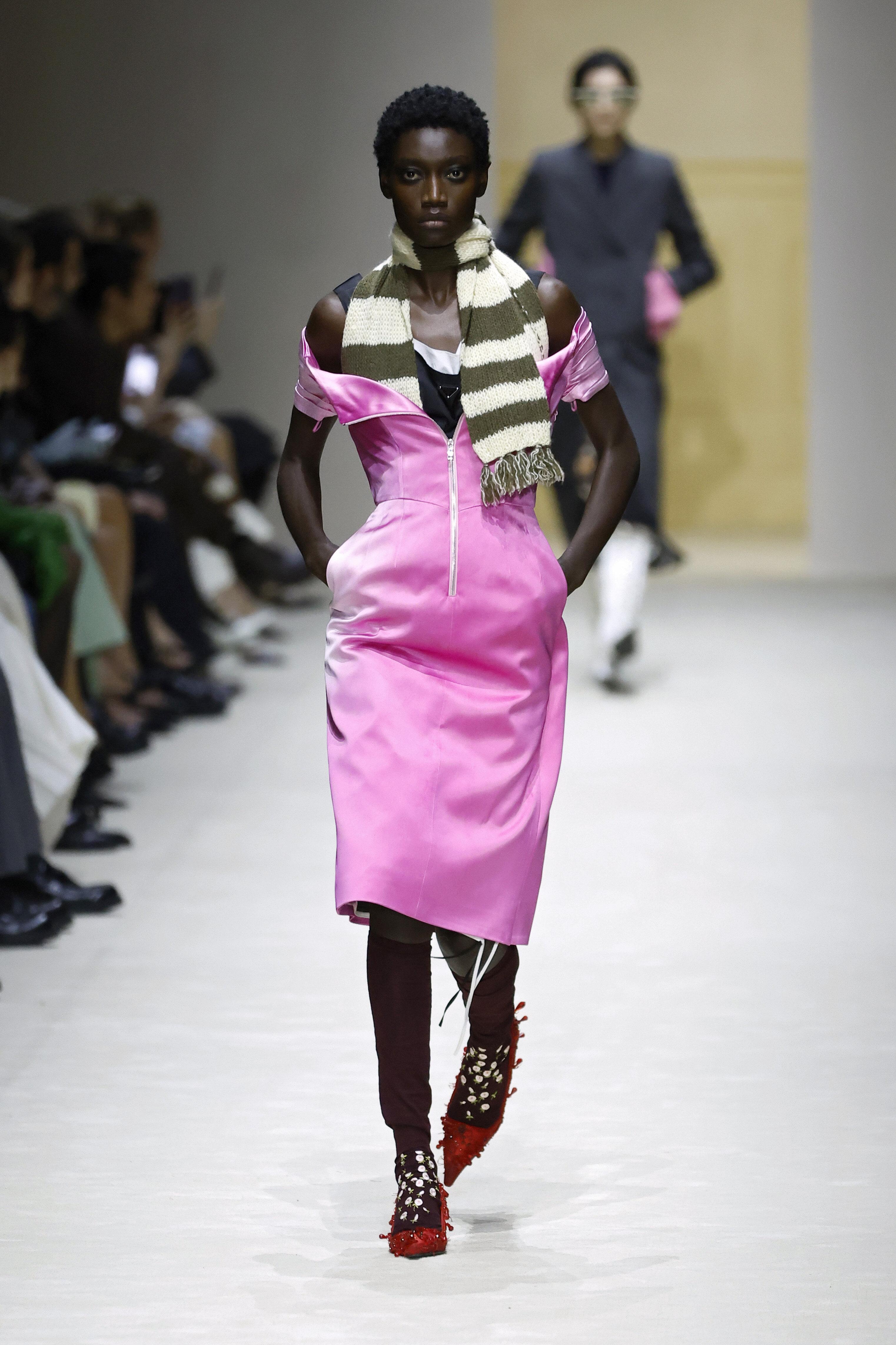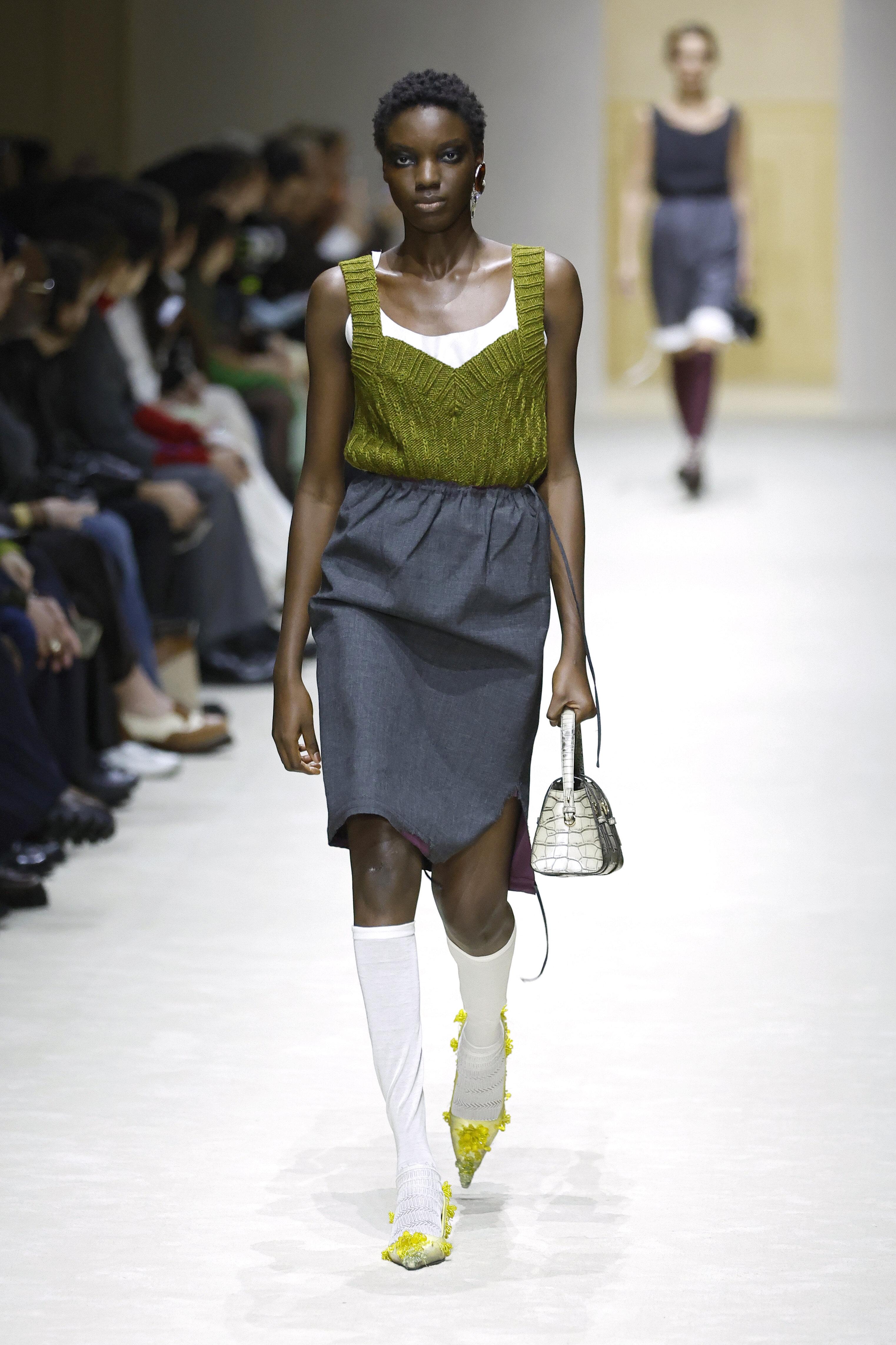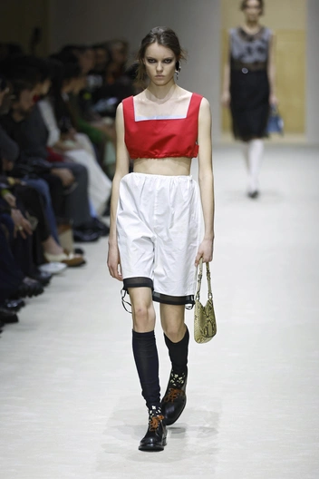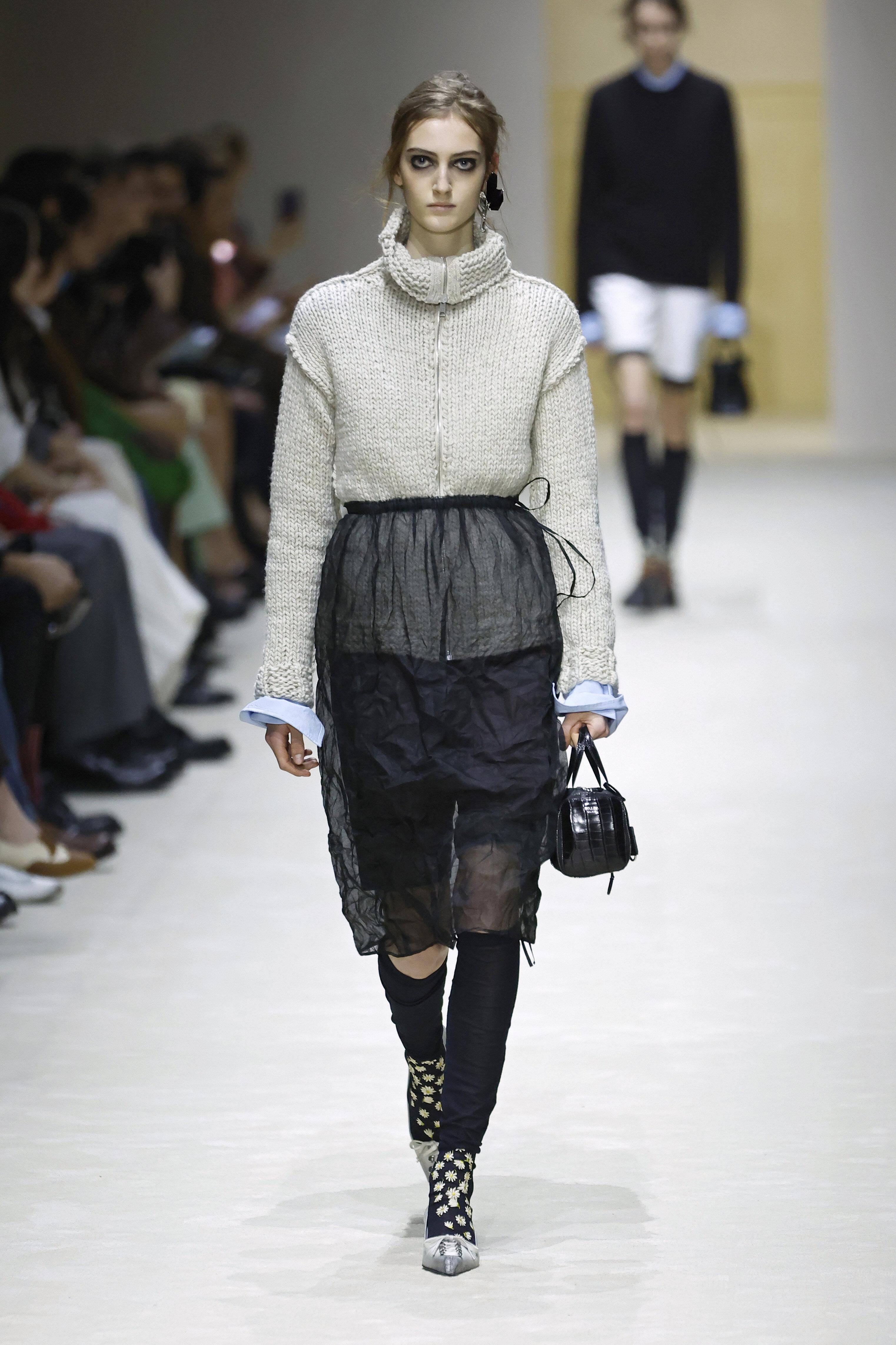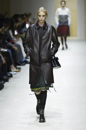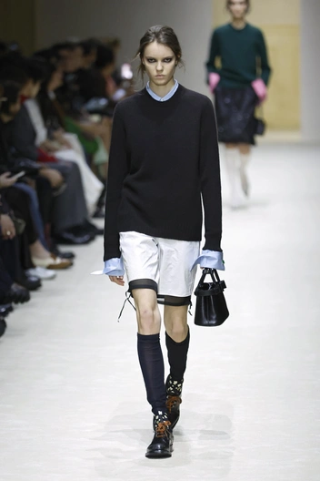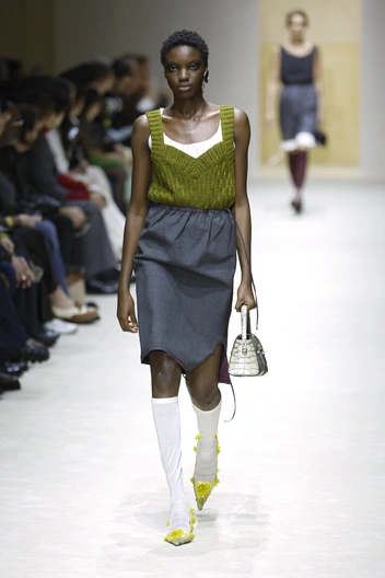 Модели выходили в образах, которые нужно рассматривать как ребус: водолазка под рубашку, рубашка под джемпер, сверху — пальто с плечами, как у советского инженера. Это выглядит тяжелым? Возможно. Но в этом и суть: Prada создает дистанцию между вами и окружающим миром.