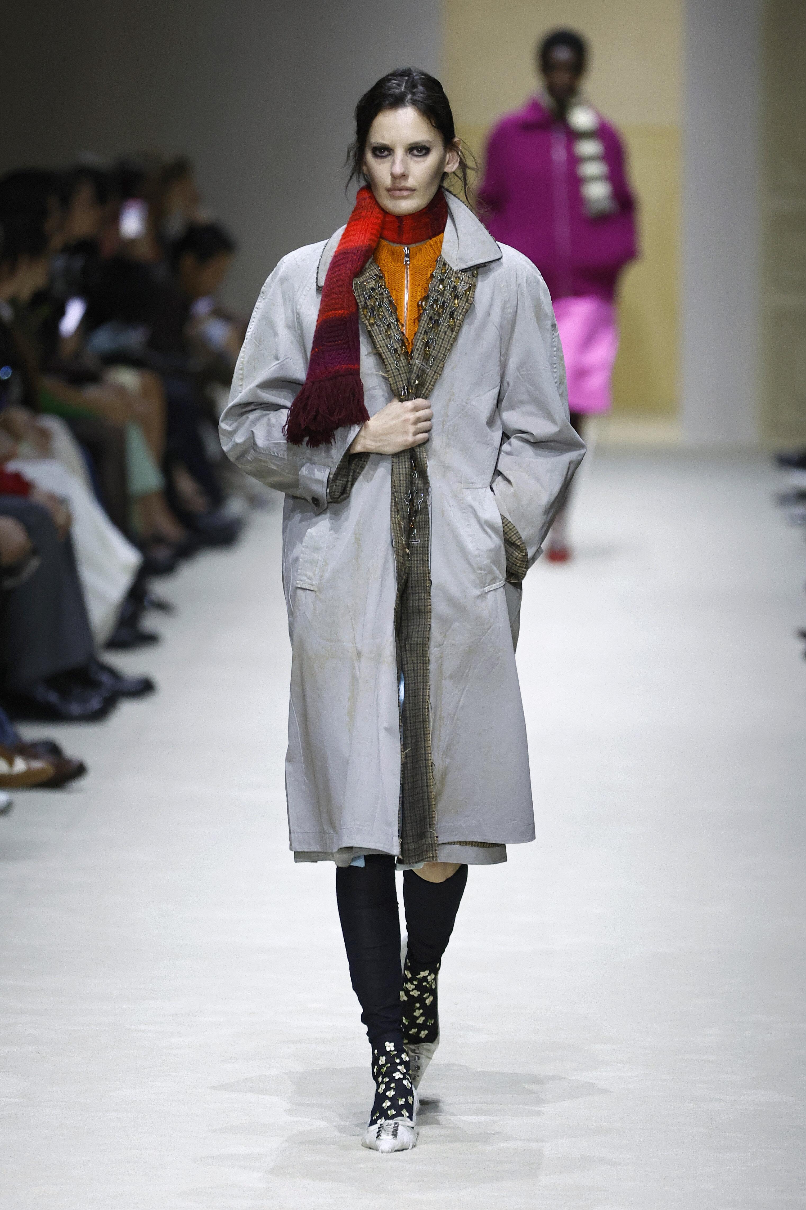 Классический трюк Миуччи Прада: сталкивать «грубое» с «нежным» и смотреть, что получится. Тяжелая серая шерсть здесь соседствует с нежнейшим шелком, который едва выглядывает из-под подола. Так и получается та самая фирменная «интеллектуальная» женственность.