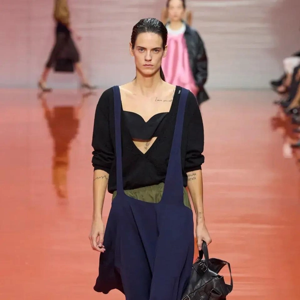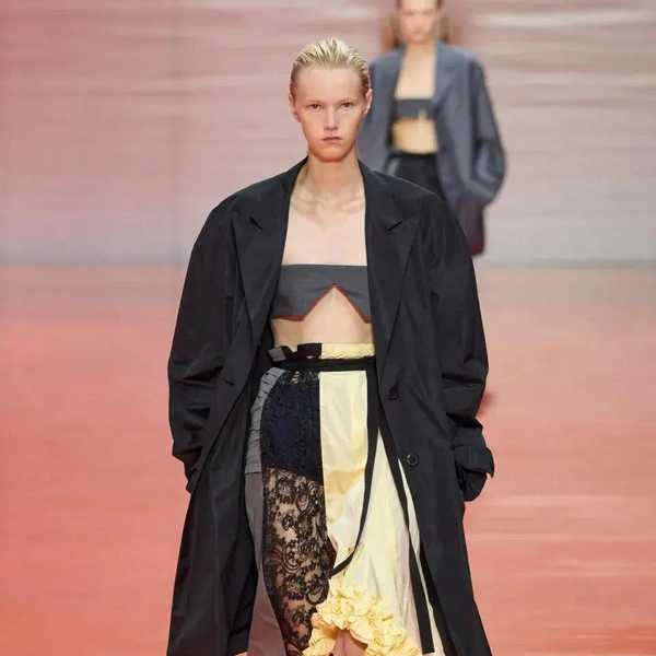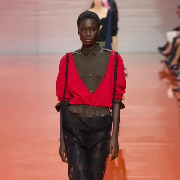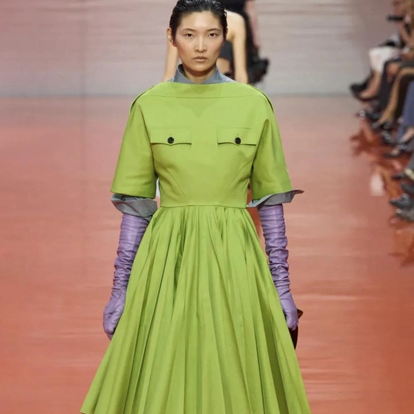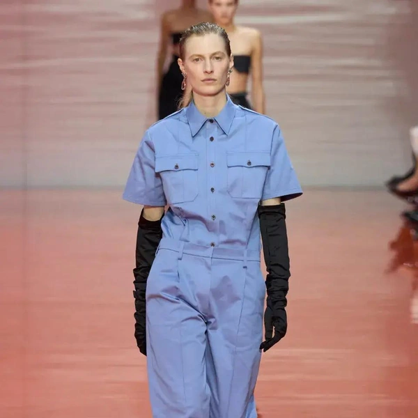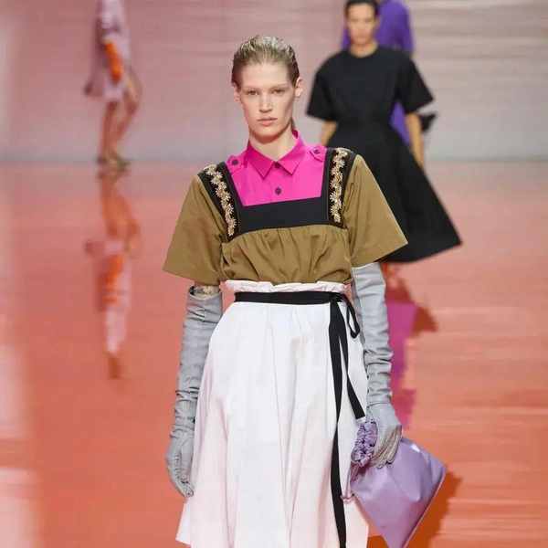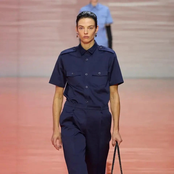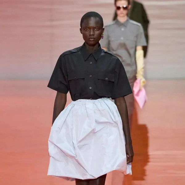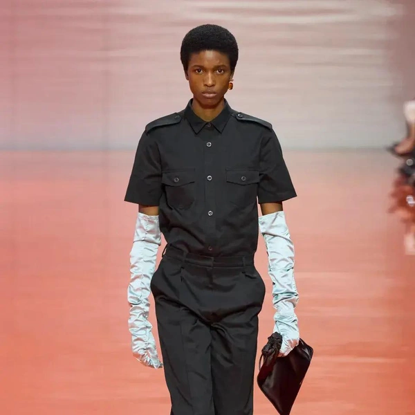 Шоу Prada весна-лето 2026 началось с образов, напоминающих рабочие униформы: «военные» рубашки с коротким рукавом, как у офицеров или таможенников; плиссированные брюки и шелковые перчатки до локтя. «Вечер в опере? Или ночная смена охранника?» — задаются вопросом наши западные коллеги. Мало кто способен увидеть в строгости и однообразии военной формы обещание свободы выражения и стиля. На бэкстейдже Раф Симонс напомнил, что его отец работал ночным сторожем, и потому униформа для него имеет иные ассоциации.