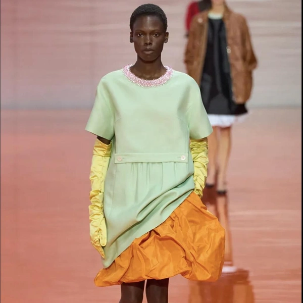 Шоу прошло в штаб-квартире бренда рядом с выставочным пространством Fondazione Prada. Обычно для шоу создавали сложные декорации: то водопады, то лабиринт из строительных лесов. На этот раз интерьер очистили до бетонных колонн и полностью залили ярким оранжевым лаком. Покрытие подиума напоминало по цвету яркий глянцевый конус дорожного знака, задавая тон коллекции. Даже те критики, кто в целом встретил коллекцию прохладно, отмечали феноменальное сочетание цветов. В одежде соединились темно-синие и серые оттенки с мятными, розовыми и ярко-желтыми. Наш фаворит — желтый бомбер.