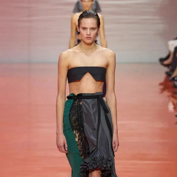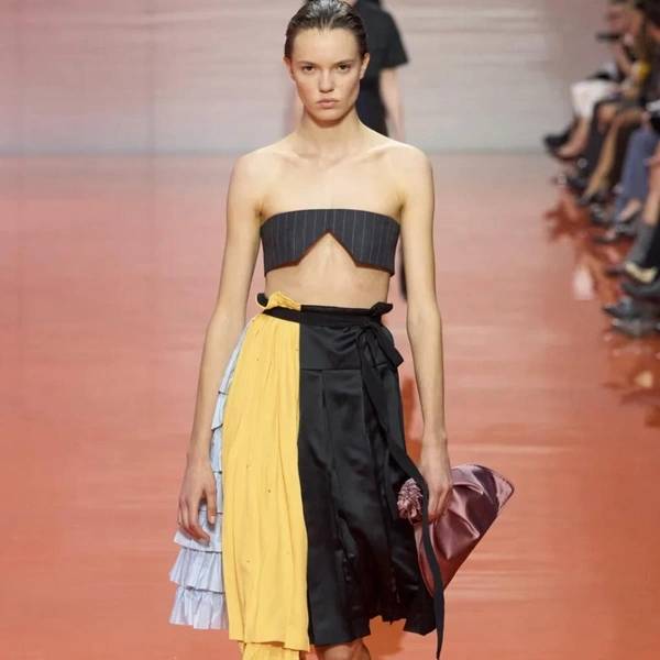 «Необычность» ощущалась сильнее всего в том, как вещи сидели на теле — а точнее, как будто и не должны были сидеть. Бра-топы без эластичной ленты под грудью: они прикрывали, но не поддерживали, не прилегали к телу, не подчеркивали его, как это обычно бывает. Идея «отстраненности от тела» проявилась и в юбках на лямках. Они оставляли открытым живот между эфемерными бра и шортами-шароварами. Не часто дизайнеры удивляют по-настоящему новой формой посадки, но юбки-сарафаны с этим справились.