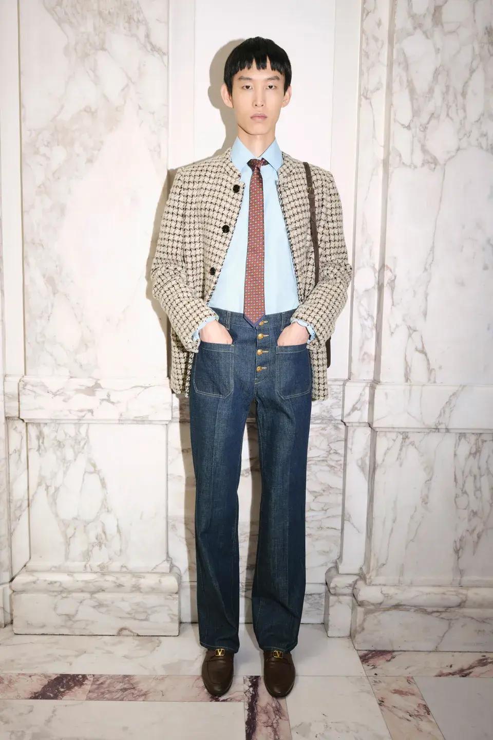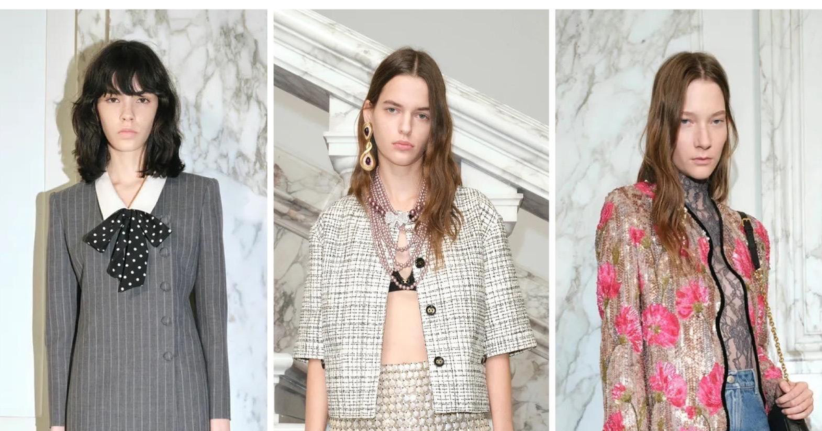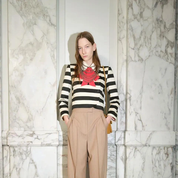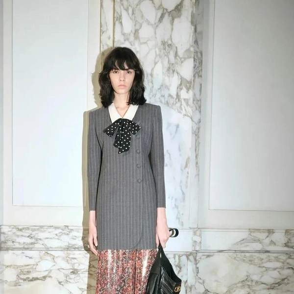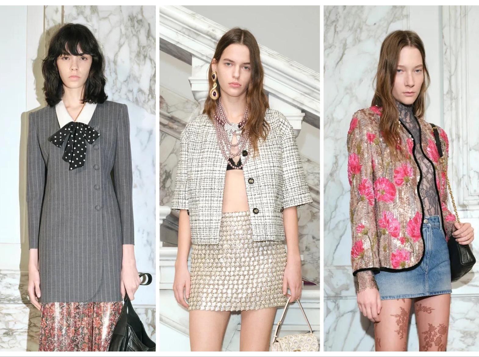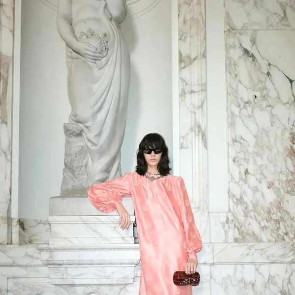 Вместо барочной тяги к украшательству — мягкий портновский подход с отсылками к 1980-м: узкие костюмы спокойных оттенков, расслабленные пропорции и уверенная римская небрежность. Иногда этот баланс нарушается — например, жакетом-халатом, кейпом с брошей из кристаллов или черными вьетнамками Rockstud, которые звучат как ироничный финальный аккорд.