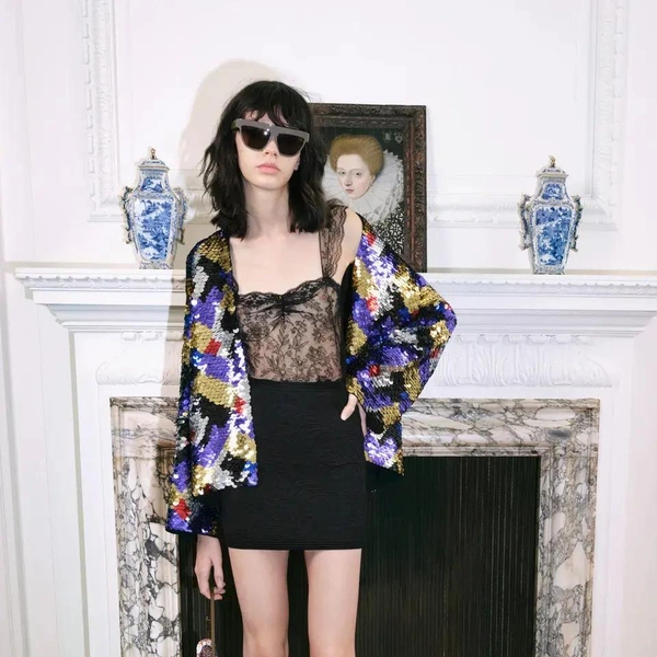 Визуально новая коллекция Valentino отсылает к расцвету Дома 1980–1990-х: массивные плечи, лаконичные мини-платья с графичным колор-блокингом, бархатные детали и стеганые фактуры. Принты практически отсутствуют, как и сложные декоративные миксы. Но это лишь видимость фэшн-дисциплины. Микелевская дерзость здесь все же присутствует. Прозрачные юбки и кружевное белье демонстративно выглядывает из-под кожаных бомберов, тонких дубленок с V-образными меховыми воротниками и жакетов; микроюбки настолько короткие, что больше похожи на широкие ремни — из носят поверх шортиков и сочетают с укороченными жакетами Spencer. Сам жакет — прямая цитата архивного Valentino, а банты на завязках — чистый Микеле! Свой метод стайлинга он называет «манипуляцией».