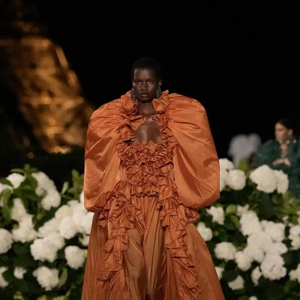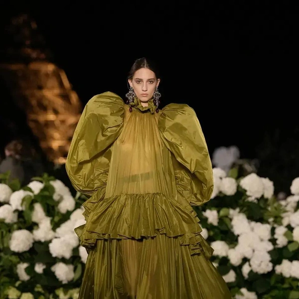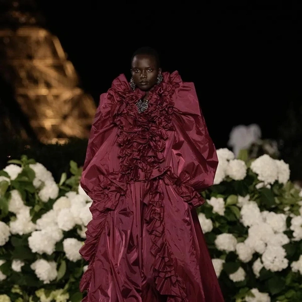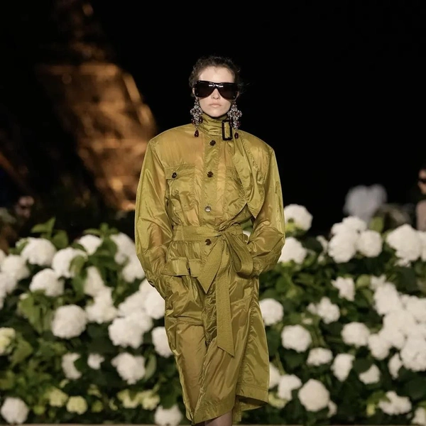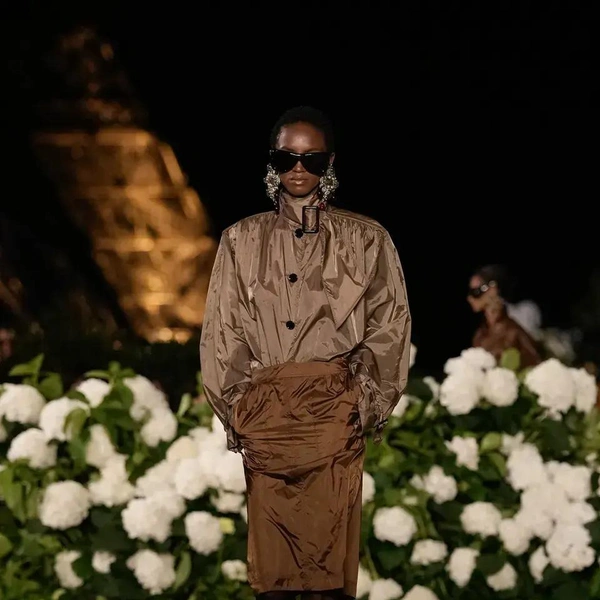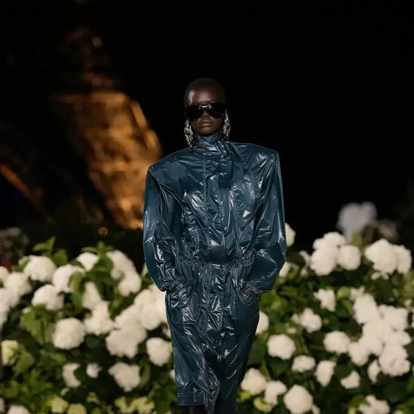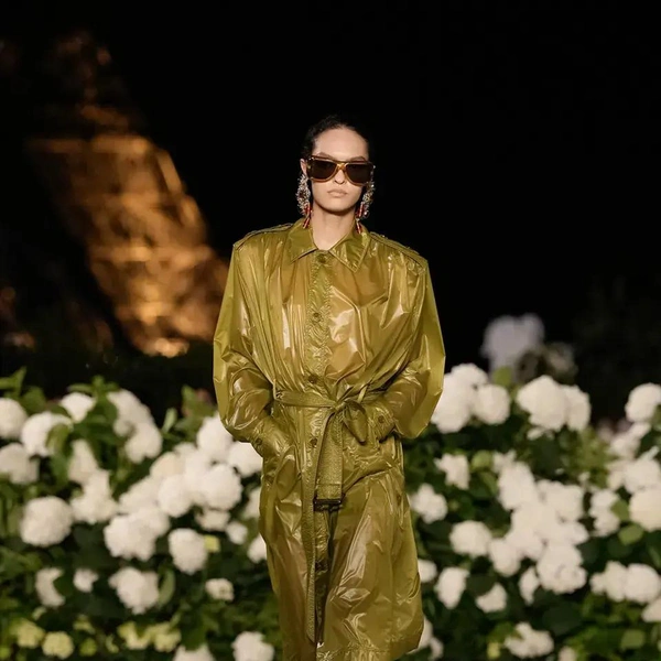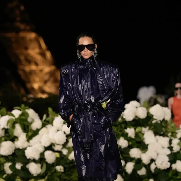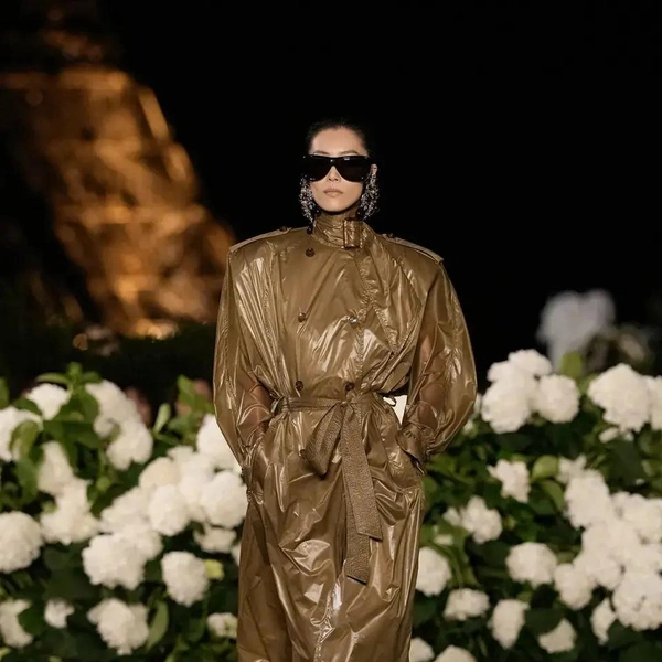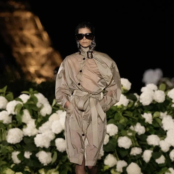 Сад с белыми гортензиями и фонарями, выстроенный у Трокадеро, стал сценой, где мода слилась с кинематографом. (Напомним, что у Saint Laurent есть собственный продюсерский центр, который поддерживает фестивальные картины). Живые изгороди образовывали гигантский логотип Cassandre — символ Saint Laurent. Атмосферу усиливал запах культового аромата Opium.