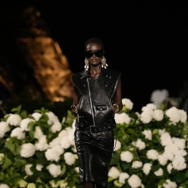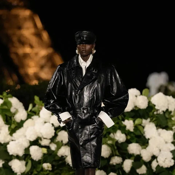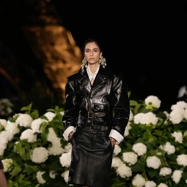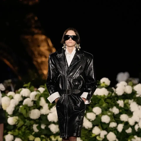 Первая часть коллекции задала тон через образы «жесткого шика»: модели выходили в кожаных юбках-карандашах, байкерских куртках с объемными плечами и остроносыми туфлями. Визуальные коды отсылали к эстетике 1980-х и к атмосфере парижской ночной жизнью. Ваккарелло прямо упомянул влияние Роберта Мэпплторпа и образ «leather daddies», адаптированный в женском исполнении.
