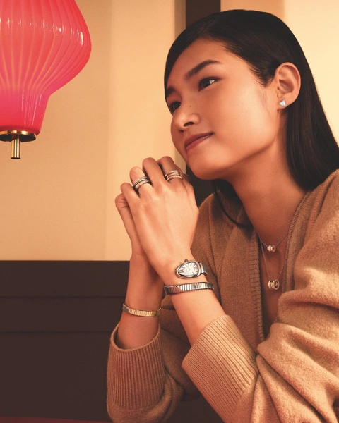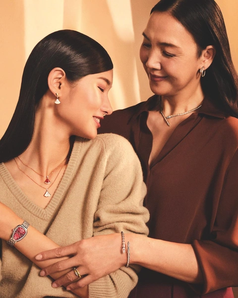 Специально для Китая подготовлен лимитированный набор Bvlgari Bvlgari, где соединяются желтое и розовое золото, сердолик и перламутр. В комплект входят цепочка с круглым медальоном, браслет проволочной формы, одиночная серьга и мягкий браслет с переворачивающимся диском, позволяющим менять камень в зависимости от настроения. Двойной логотип здесь звучит как декоративный элемент и как отсылка к истории марки.