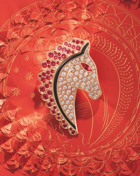 Одним из ключевых объектов в этой коллекции стала уникальная и выразительная брошь в форме лошади, созданная на основе архивного украшения 1970-х годов. В желтом золоте она сочетает более 40(!) кабошонов рубинов, бриллиантовое паве и выразительные детали из черного оникса. На разработку дизайна ушло около 130 часов, еще 50 — заняла работа ювелиров, что подчеркивает традиционную для Дома сложность исполнения. (Неразрешимых творческих задач здесь просто не бывает!) В броши заложена идея талисмана, связанного с пожеланиями энергии, уверенного старта и даже превосходства. Быть всегда на коне!