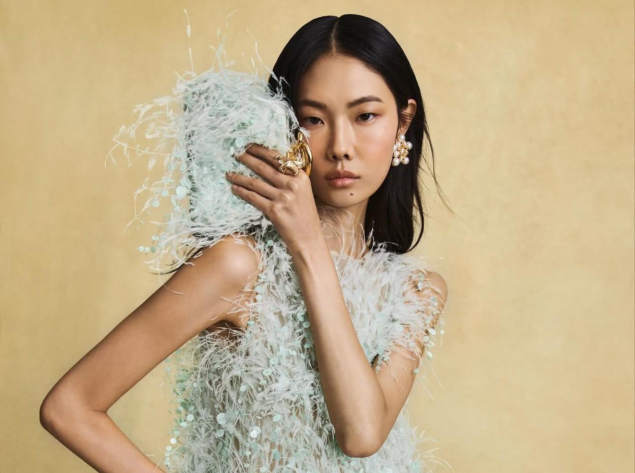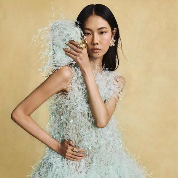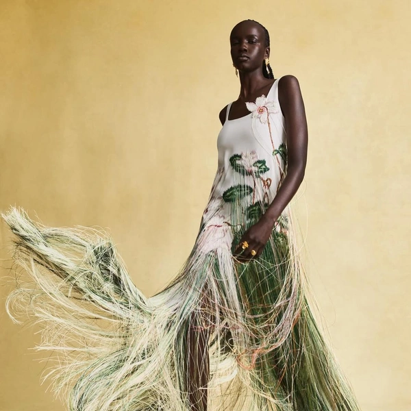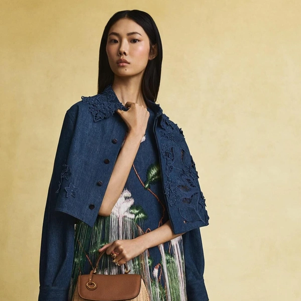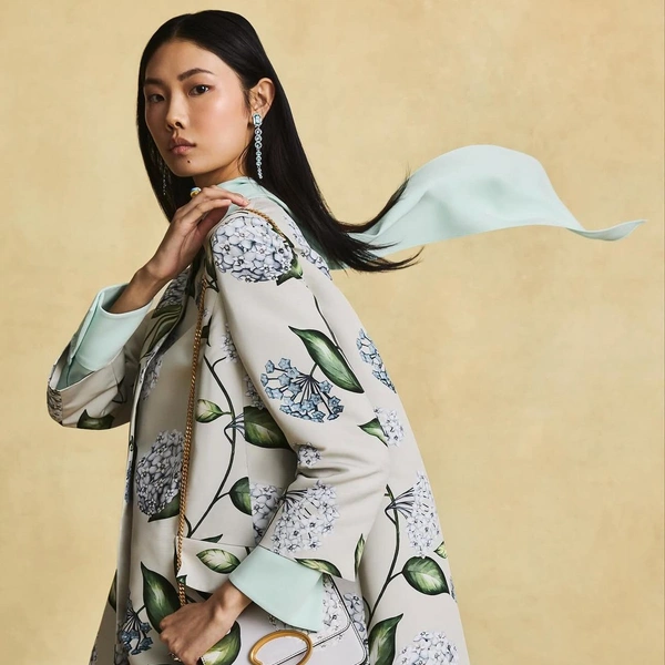 Отличный повод рассмотреть внимательнее модели из новой весенней коллекции 2026. Проводить шоу в бренде не стали, ограничившись публикацией лукбука. Дизайнеры сохранили верность фирменной элегантности Oscar de la Renta, но внесли свежий взгляд на пропорции и фактуры. В палитре преобладают мягкие, «весенние» оттенки — сливочный, небесно-голубой и светло-зеленый. В работе использованы шелк-шифон с цветочным принтом, невесомые перья в качестве богатого и хрупкого декора на трикотаже. Но наш фаворит — бахрома, которая «распускается» из флористических аппликаций.
