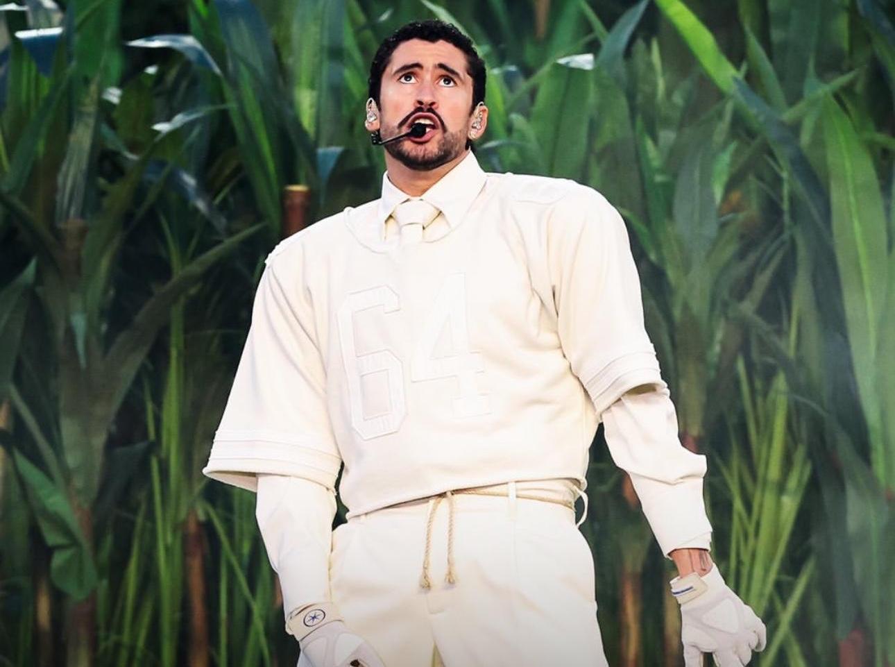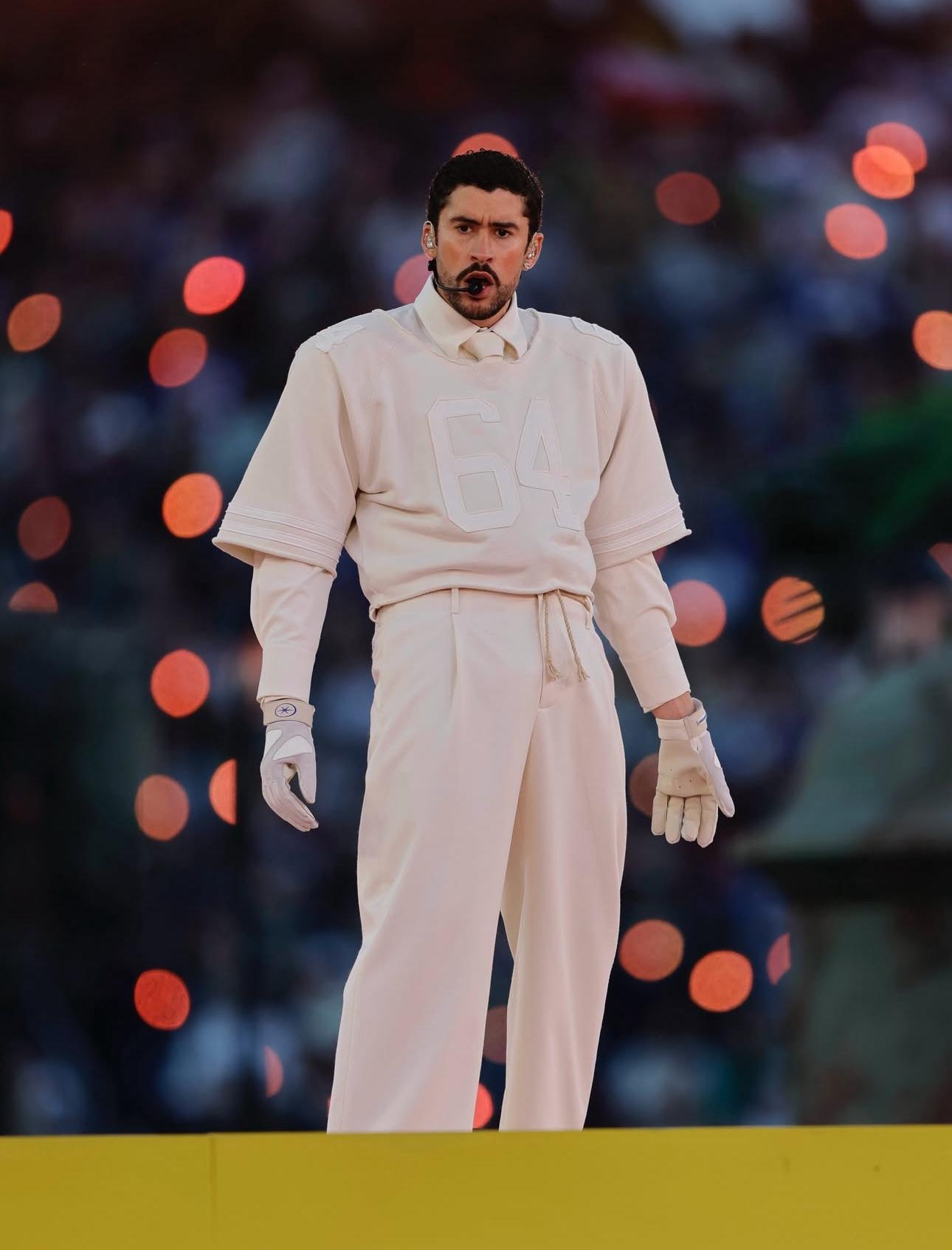 Никаких брендов роскоши на сцене мы не увидели, Бенито решил выступить «ближе к народу» и сделал ставку на Zara Минималистичный кремовый комплект включал рубашку с воротником и галстук, спортивную майку с фамилией Ocasio и номером 64, брюки-чиносы и перчатки. Позже в течение вечера Bad Bunny добавил к образу двубортный кремовый пиджак. Костюм был собран стилистами Стормом Пабло и Марвином Дугласом Линарес. Число 64 на футболке связано с 1964-м — годом рождения матери артиста, Лисаурие Окасио, что укладывается в привычку Bad Bunny вшивать личные коды в визуальные детали.