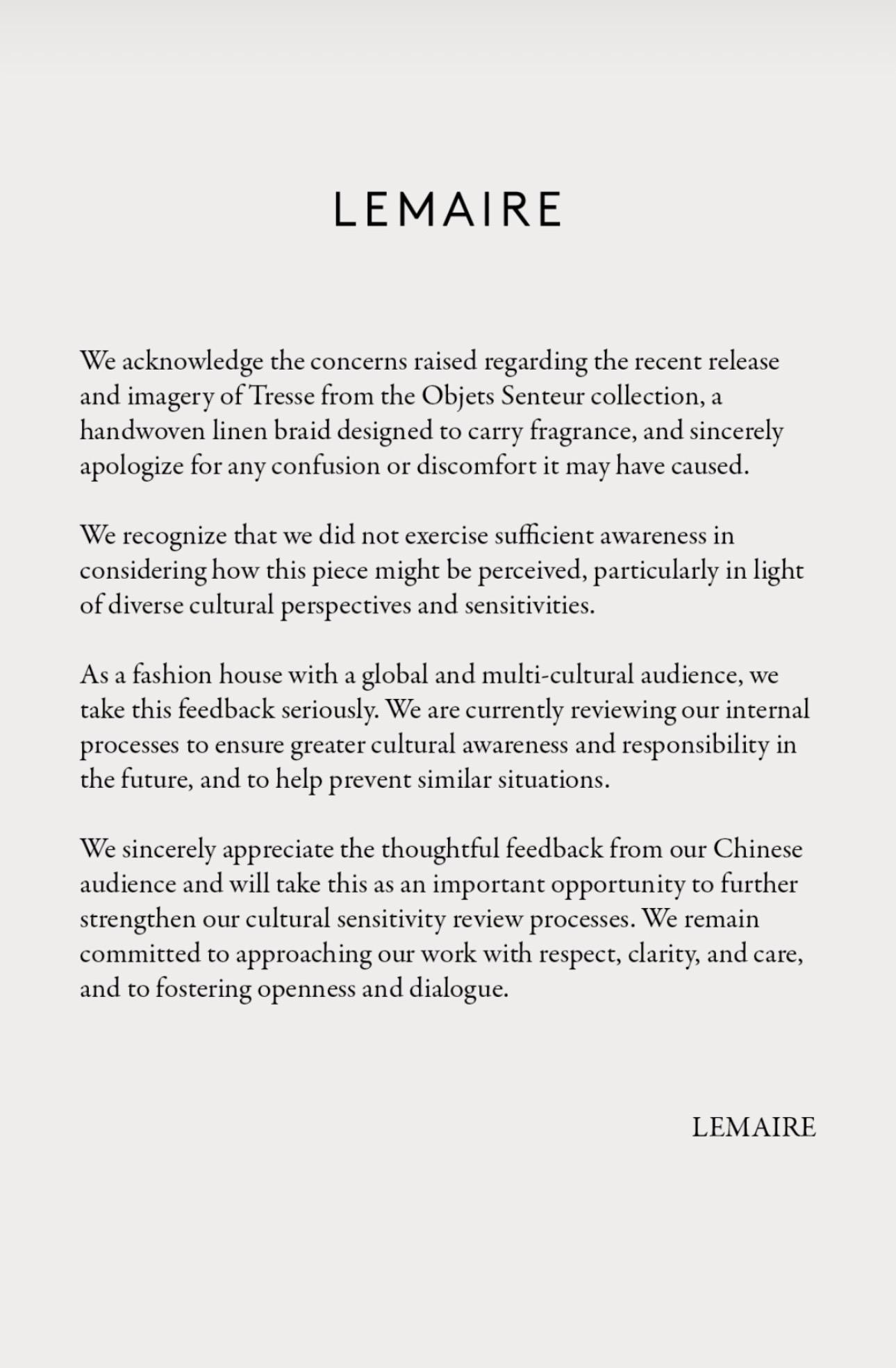 Также компания признала, что недостаточно учла различия восприятия и культурной чувствительности в разных странах. Lemaire отметил, что как «международный бренд должен проявлять больше внимания в творческих решениях, и пообещал пересмотреть внутренние процессы, чтобы избежать подобных ситуаций в будущем».
