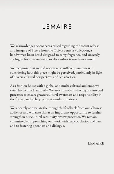В официальном заявлении Lemaire сообщил, что заметил общественную дискуссию вокруг объекта Tresse и его подачи в коллекции Objets Senteur. Компания пояснила, что речь идет о изготовленном вручную плетеном льняном предмете, предназначенном для удержания аромата. Не более того. Тем не менее, бренд принес «извинения всем, кого изображения могли задеть, обеспокоить или расстроить».