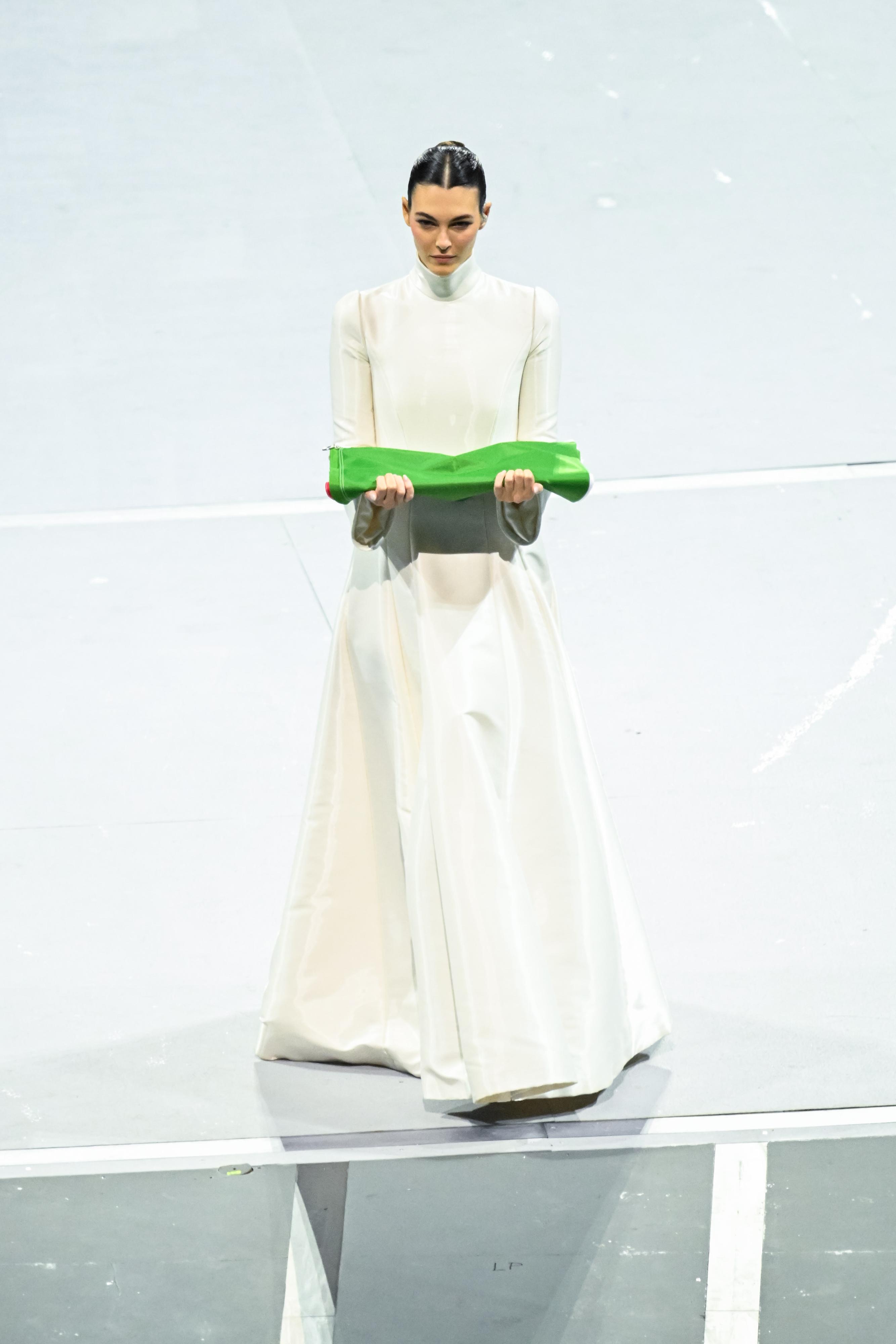 Сабрина Импаччаторе, знакомая международной аудитории по ролям в сериалах «Белый лотос» и «Газета», представила музыкальный номер, построенный как путешествие во времени и посвященный столетней истории зимних Олимпийских игр. На сцене сменялись десятки костюмов, включая эффектный винтажный лыжный ансамбль, созданный Эмилио Пуччи для принцессы Сорайи Иранской. Именно в таком образе она появлялась в Кортине во время зимних Игр 1956 года — первых Олимпийских игр, прошедших в Италии.