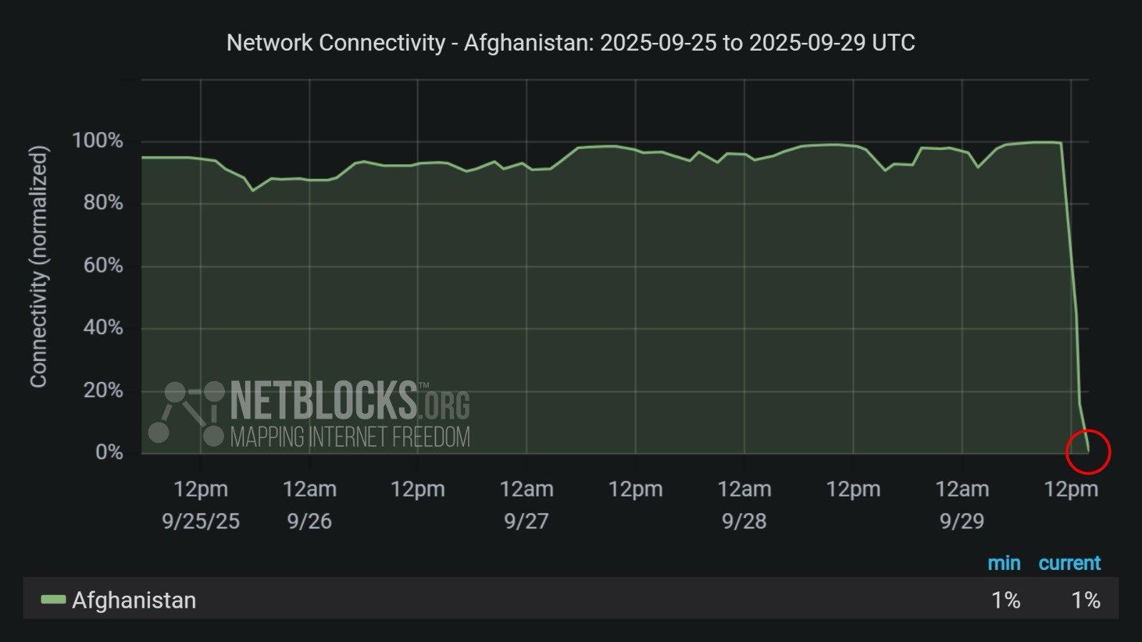 Накануне вечером организация NetBlocks, занимающаяся мониторингом свободы интернета в мире, cообщила, что по всему Афганистану полностью пропало интернет-соединение. Также недоступна мобильная связь.