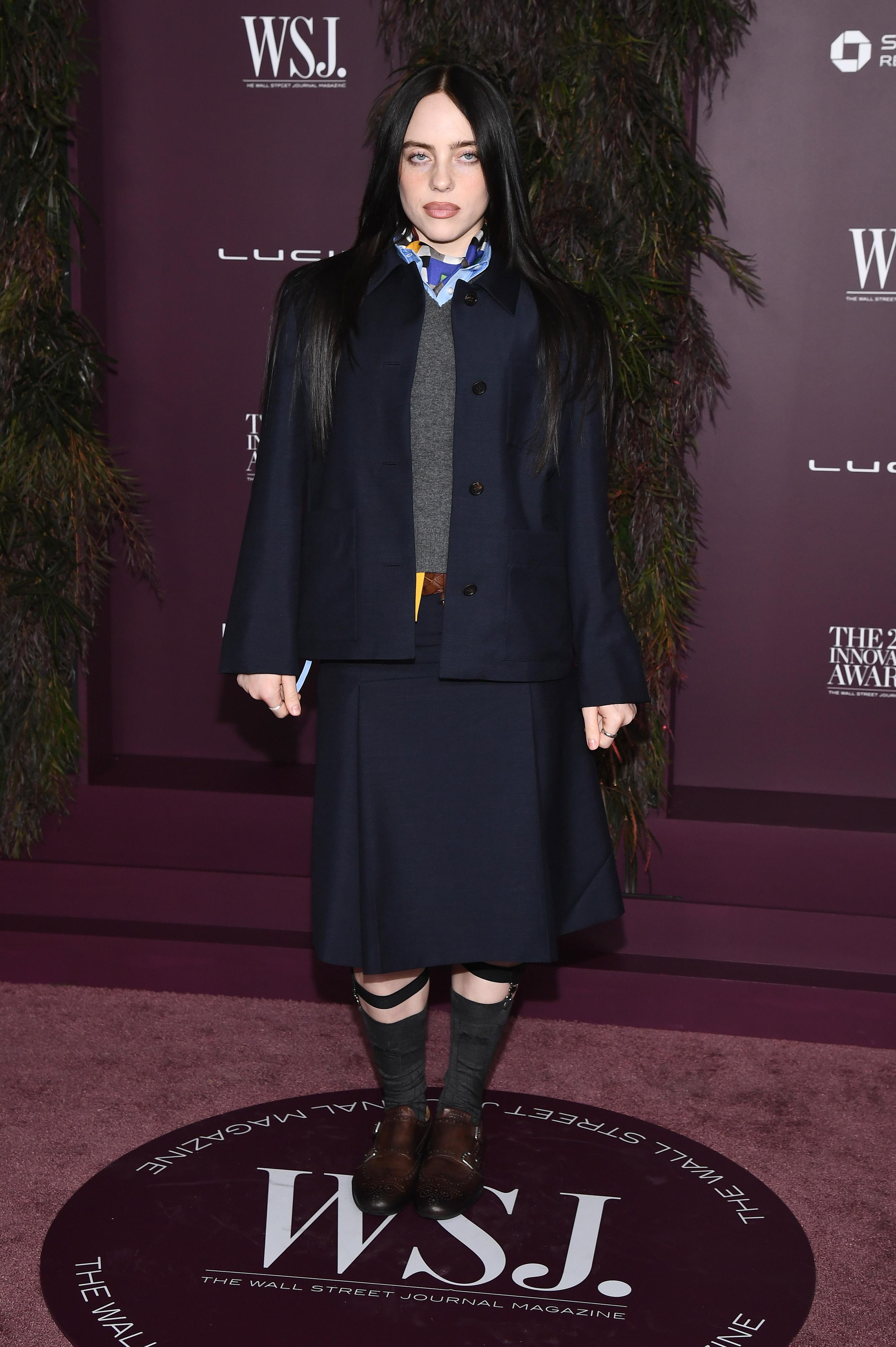 Билли Айлиш, удостоенная премии «Музыкальный инноватор», появилась на торжестве в костюме Miu Miu из весенней коллекции 2026 года — ее показали в начале октября на Неделе моды в Париже. Комплект включал укороченный жакет с юбкой-миди в стиле preppy, голубую рубашку, шерстяной жилет и миниатюрный галстук-аскот, а образ был дополненный гетрами и туфлями-монками. Выход выглядел неожиданно «дневным» для красной дорожки и вечернего светского мероприятия, но именно в этом и заключалась его сила — в отказе от гламура в пользу ироничного интеллектуального шика.