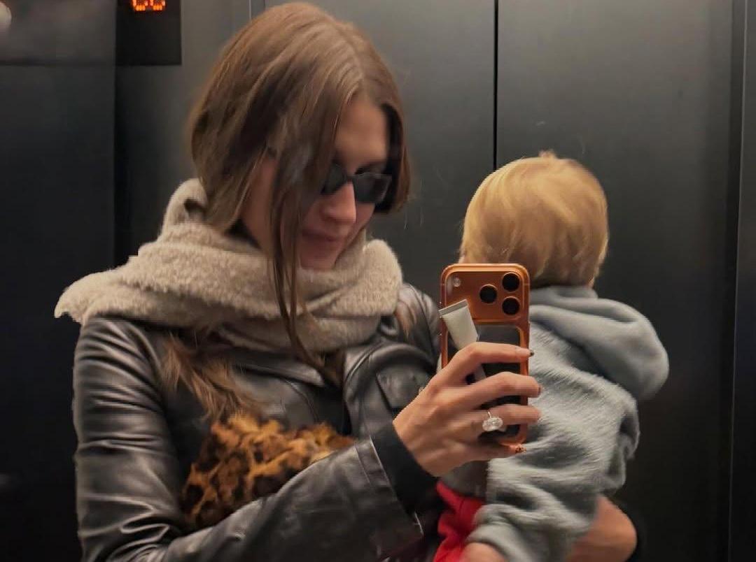 Модель поделилась несколькими кадрами из токийского путешествия в своем Instagram: малыш, завороженный цифровыми инсталляциями, и зеркальное селфи Хейли в лифте, где она держит его на руках, совершенно невозмутимого к мировой славе своих родителей.